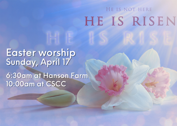 Please join us for our Holy Week worship services, as together we walk with Jesus through his last days in Jerusalem. Our Palm Sunday service is at 10am on Sunday the 10th and will be followed by the Sunday School’s Living Gift Market on the church lawn. The Maundy Thursday communion service is at 7pm on the 14th and the Good Friday Musical Meditation is at 3pm on the 15th. Our Easter Sunday celebration begins at sunrise (6:30am) at Hanson Farm on the 17th and continues here in the church sanctuary with our 10am worship service.