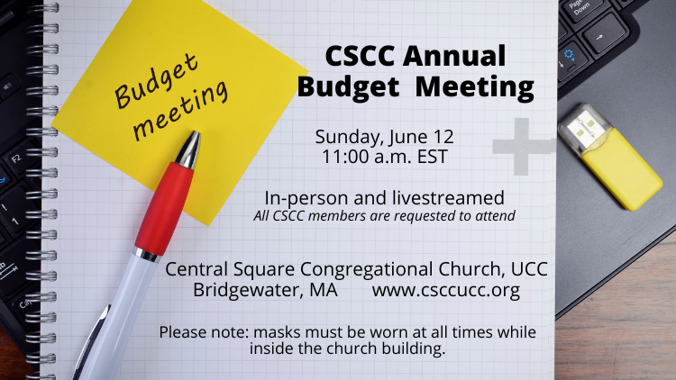 The annual budget meeting will be held in person following worship, and will also be livestreamed, on Sunday, June 12 at 11am. The link will be on our website (www.csccucc.org), and will also be emailed out the prior week. The livestream will not be available after the meeting for playback.