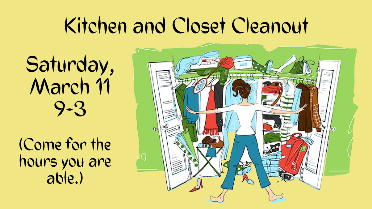 • Kathleen announced that there will be a kitchen and closet cleanout on March 11, 9-3, to go through all the stuff that’s stored away, and combine like items, supplies everyone can use.