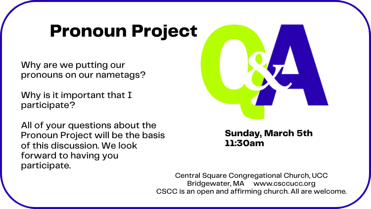 Kathleen noted that on March 5, Marci Langevin will be hosting a Q&A discussion regarding the Pronoun Project, following worship. She also noted that we got a lot of forms back from people in worship, picking their pronouns, and she feels like it’s going very well.