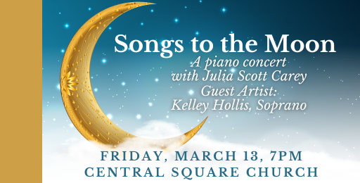 We all enjoy Julia’s music on Sunday morning, and on Friday, March 13 we will all have the opportunity to attend a concert where Julia will be sharing her wonderful talent as a pianist. The theme this year is “Songs to the Moon”.  Come and enjoy an evening out! You may dress up or be casual, and you may bring your own bottle of wine if you wish to enjoy it at the reception afterwards. Doors open at 6:30 and the concert begins at 7:00. Tickets may be available at the door, subject to availability. The cost is $35 per person, $17.50 for seniors and students.