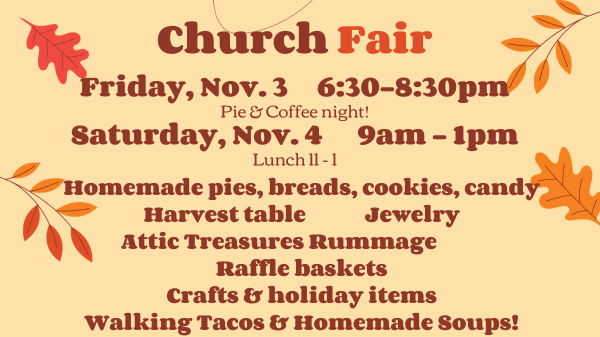 Diane reported that the fair will take place on Friday evening, Nov. 3, 6:30-8:30 (“Pie Night”) and Saturday, Nov. 4, 9-1. Plans are going well. Homemade soups and walking tacos will be sold for lunch. Diane asked permission to have raffles at the fair, and Rev. Beth asked for the same on the night of the concert (11/10). Diane motioned, Rev. Beth seconded. The motion was approve.