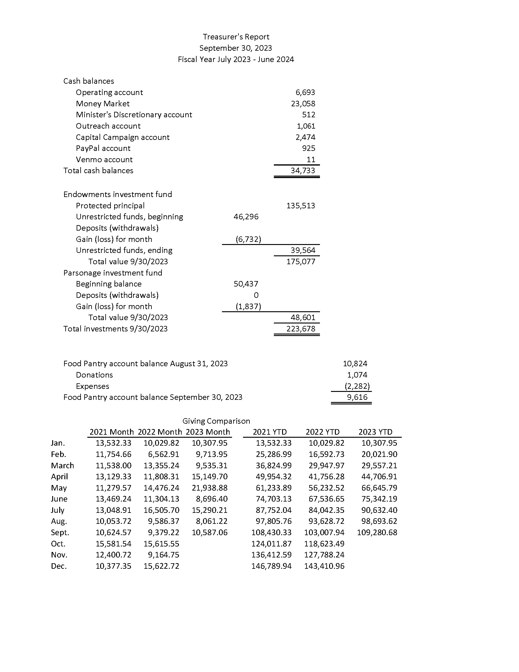 Dave reported that we did OK last month. We’re on track with budget revenue, and expenses are a bit lower than budget so far. Rev. Beth asked Dave if, with all the new technologies (venmo, paypal, etc), is the job still manageable? Dave replied that it’s a little more time at the end of the month, but it’s still fine. As an aside, it was noted that Venmo has lower fees than Paypal, so if people have both at their disposal, Venmo is better.