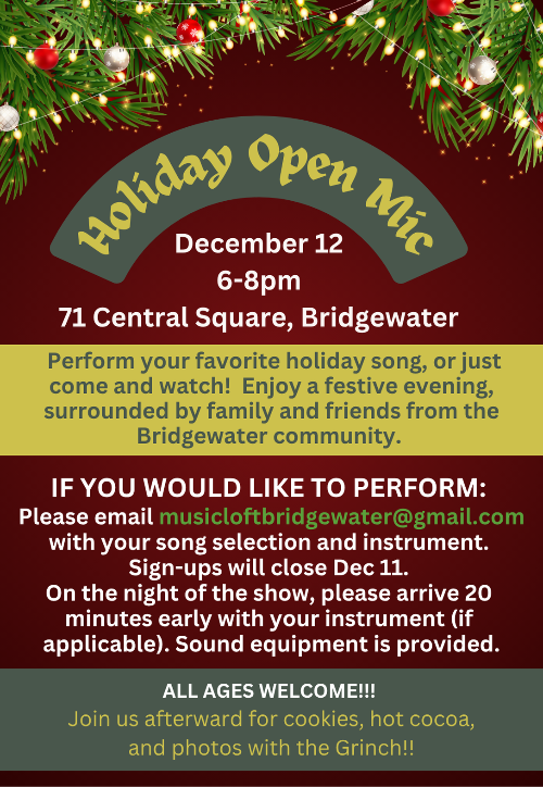 Lots of clergy meetings. Bridgewater clergy worked on ecumenical Thanksgiving service. It will be happening and the other churches are working on the service. Reverend Beth is working on All Saints worship. The children will be participating in the building of the altar. There will be a Holiday open-mic December 12, 6-7:30pm, 7:30 to 8 will be cookie and cocoa time and Mr. Grinch will come to take pictures. There is a need for assistance with making cookies for the event.