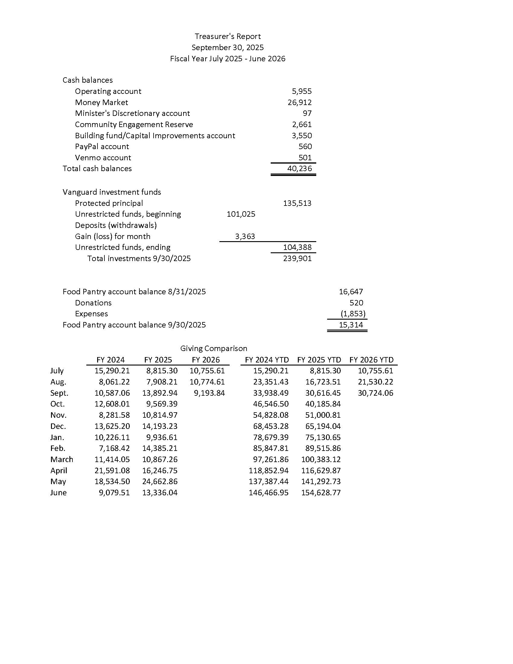 Food Pantry discussion - Reverend Beth spoke to Bridgewater Town Manager. The biggest concern is transportation. Clients getting food back to their homes is problematic. Town Manager and new director to Senior Center working on a transportation grant. They will attempt to dovetail these needs with the grant. Patrick Donahue will be preaching on October 26th.