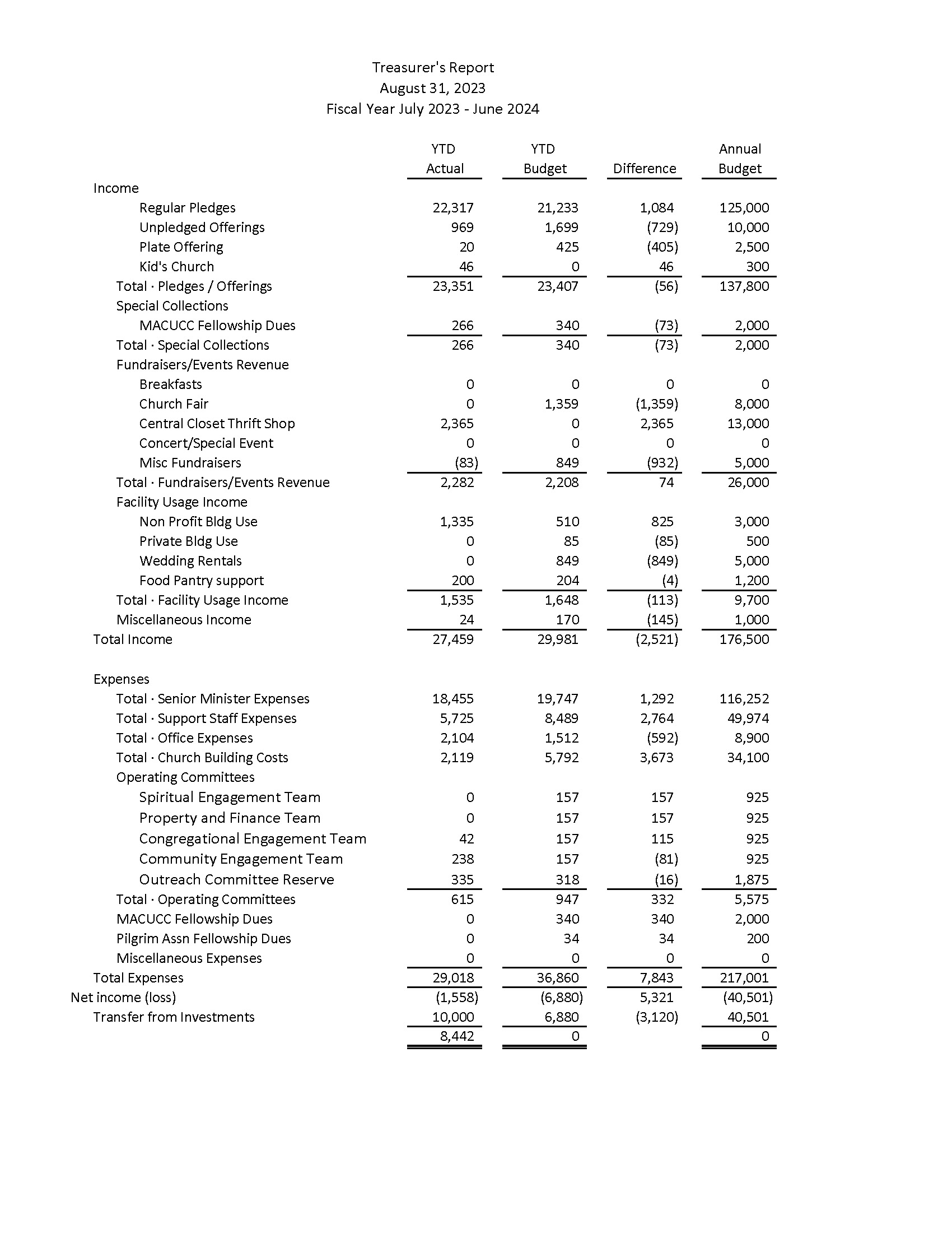 Rev. Beth thanked all who helped her and her family during her recent sick leave and surgery. She worked with the Spiritual Engagement Team on updating the child protection policy. She has been working with the Community Engagement Team on their projects, especially the service trip next summer. She noted how she loved the August worship format. She worked on updating the church brochure, and ordered copies. She has been researching fundraising and networking opportunities, and connected with a grant writer. There is a book discussion on October 29.