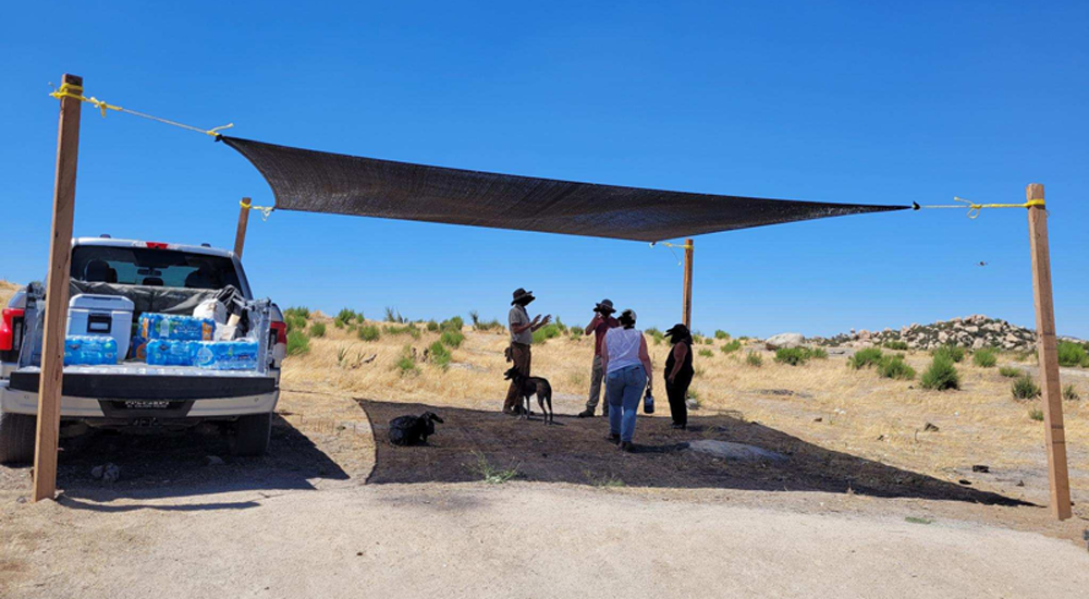 When we arrived in Jacumba, we passed through a Native American reservation on the way to the site. There were vast tracts of land that looked dry. There were some scrubby bushes, mobile trailers randomly dotted the area and the truck’s thermometer read 107 degrees Fahrenheit. The site we arrived at looked desolate. There were neither immigrants nor Border Patrol present. All we were able to see for miles was a large container for water, some rocks, some trash, and a port-a-potty. “What if our cars break down?” I thought. Describing to AAA or my husband where we were would be interesting, to put it mildly.