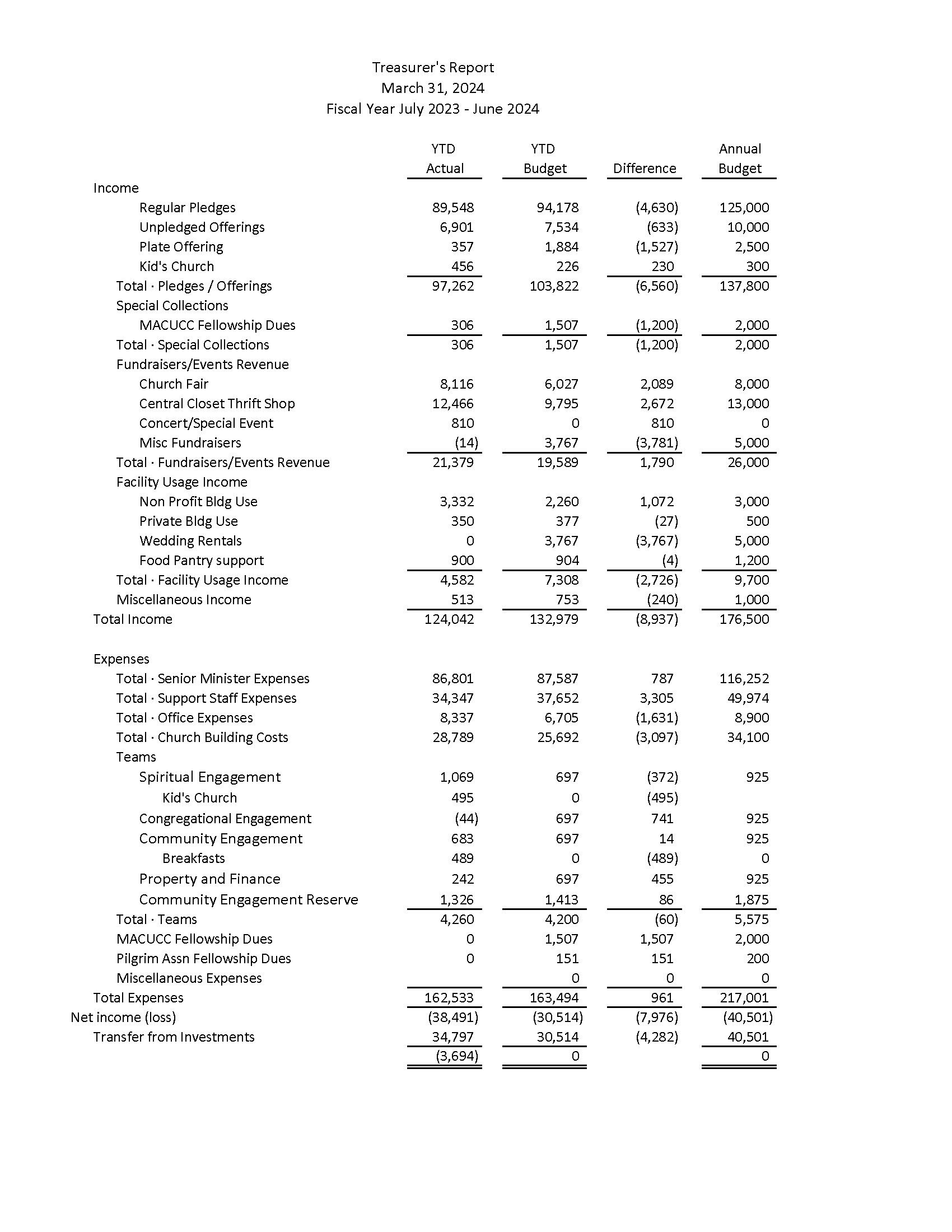We’re continuing on generally the same trajectory, but falling a little more behind each month. We’re running a little behind last year’s giving. He had to take another $10,000 out of investments, which brings it up to $35,000 on the fiscal year. We’re not buying winter oil any more for the season, so that’s good. Regarding the budget, at some point we’ll have to turn it around (passing deficit budgets), or we will run out of money. Quarterly statements went out to donors this week so people will see if they’re behind. Rev. Beth wrote thank yous on all of the statements. The question was asked, why would someone not pledge? Some don’t want to be obligated was one reason given. It was suggested that we might follow up with people who are behind on their pledges.